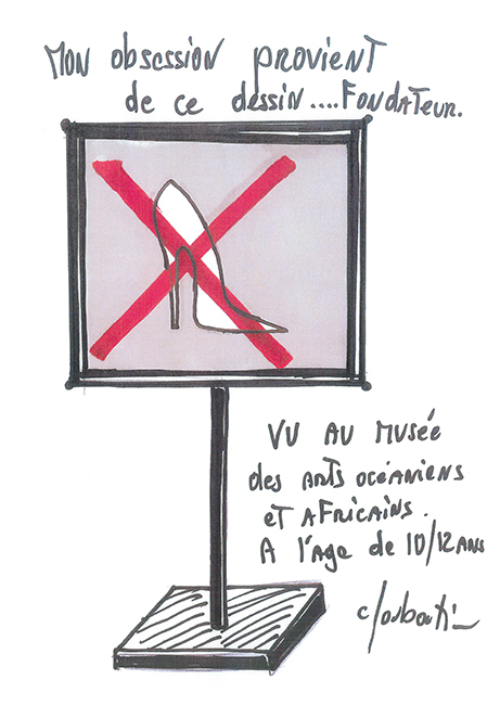 Lors de l’une de ses nombreuses escapades, le jeune Christian Louboutin se retrouve face à face avec un pictogramme interdisant aux femmes le port des talons hauts pour éviter de rayer le parquet et faire sauter les émaux des mosaïques.