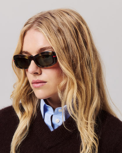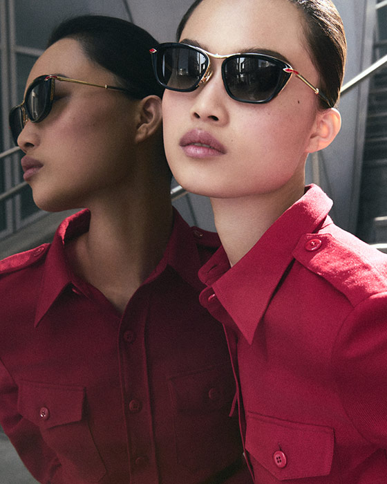 Bringing the Maison's signature flair to life, the Dolly, So Kate, Kate, Hot Chick, Anouk, Greggo, Roller, and Our Georges lines each showcase distinct character. Dolly’s architectural frames and palmette detailing exude Art Deco glamour, while So Kate’s red-sole-inspired silhouette adds elegant curves. The frame of the Kate sunglasses elegantly mirrors the shape of the signature red sole of the eponymous pumps, while the Hot Chick model features a sensual curve inspired by the iconic V-shaped notches of the stiletto of the same name. Anouk captivates with its rounded silhouette, a tribute to actress Anouk Aimée, renowned for her signature round glasses. Greggo channels chic minimalism with polished black acetate, echoing classic Oxford shoes' leather, while the ornamental spikes of the Roller are inspired by the aesthetic codes of the Maison's men's collection. Lastly, Our Georges dazzles with avant-garde gold accents, signature studs, and subtle red touches—a nod to Christian Louboutin’s iconic style.